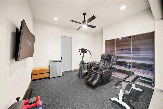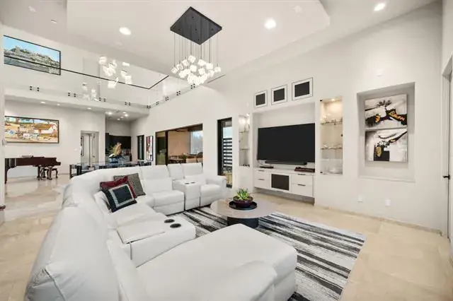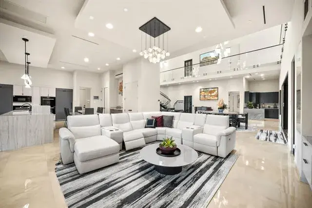 A front courtyard and dramatic floating staircase create a stunning first impression, completed by polished porcelain floors throughout, all around glass railings, and soaring 25ft ceilings in the main living and dining. The home features 6 oversized bedrooms, 6 full baths, 2 half baths, 5 living areas, 2 dining areas, private study, exercise room with glass-door sauna, game room, media room, and a second floor coffee bar with kitchenette.