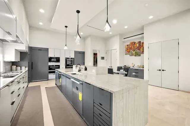 The chef’s kitchen showcases paneled Sub-Zero refrigeration, Gaggenau cooking modules, double ovens, steamer, warming drawer, two Miele dishwashers, dual sinks, and extensive custom cabinetry. Over 15 slabs of Brazilian quartzite are featured throughout, including waterfall countertops and a dramatic quartzite fireplace.