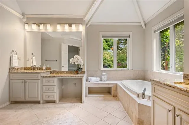 Outdoor living is equally considered. The covered patio, framed by wood beams, overlooks the pool and spa, creating a natural extension of the home. From there, the grounds open across 1.74 acres, with wide lawn and mature trees leading to the water’s edge, giving the setting a sense of scale, privacy, and quiet separation.