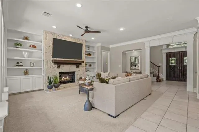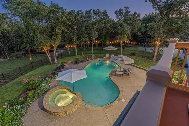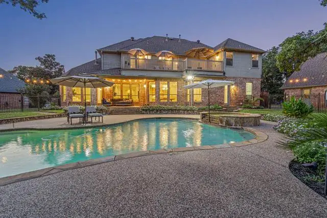 Stunning home in highly desirable Fox Hollow, situated on a peaceful 1-acre cul-de-sac lot surrounded by mature trees and beautifully landscaped grounds. Zoned to the exemplary Carroll ISD, this exceptional residence combines luxury, comfort, and functionality. Inside, you’ll find 5 spacious bedrooms, 5 full baths, an executive study with custom built-ins, an upstairs game room, a media room complete with wet bar and balcony access and an impressive 5 CAR GARAGE WITH SHOP AND SECOND FLOOR, 3 attached and 2 detached, perfect for car enthusiasts or additional storage. The gourmet kitchen is a chef’s dream, featuring extensive cabinetry, a new gas cooktop, new double ovens, a large island and a breakfast bar that opens to the inviting family room with stunning views of the backyard. The primary suite is a private retreat with a spa-inspired bath including dual vanities, a glass-enclosed shower, a freestanding jetted tub and an oversized walk-in closet with built-ins. The backyard is like a private park, featuring a sparkling pool and spa, a tranquil pond stocked with fish and a cascading waterfall, multiple lounging areas and a cozy firepit for cool Texas evenings. Additional highlights include a well for irrigation and a new roof in 2021.