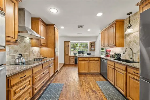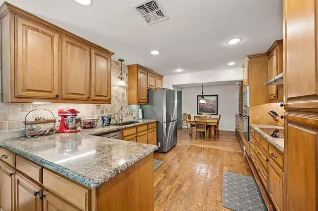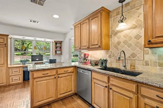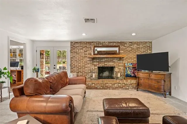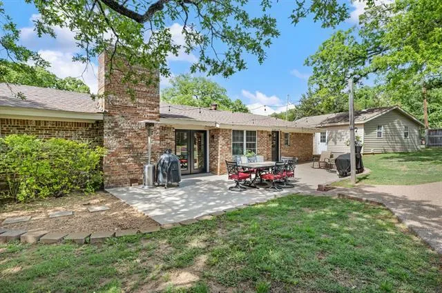 The single-story ranch home features 4 bedrooms and 3 baths with a functional layout, including a spacious living area with a brick fireplace and large windows that bring in natural light and views of the backyard. The kitchen offers granite countertops, ample cabinetry, and a bright breakfast area overlooking the grounds.