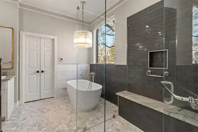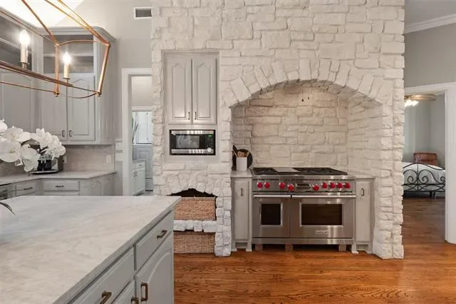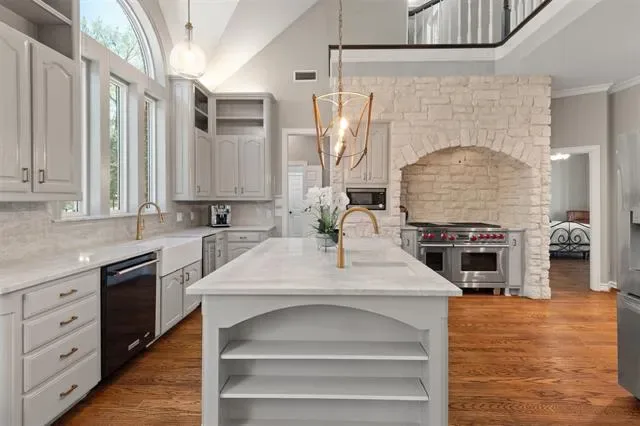 Inside, timeless architecture meets elegant updates. Wood floors, custom lighting, and a soft neutral palette create a warm, refined feel throughout. The open living and kitchen design centers around a stunning, updated kitchen featuring an oversized island, Taj Mahal Quartzite Countertops, built-in beverage refrigerator, and a high-end Wolf gas range — perfect for both everyday living and entertaining.