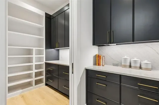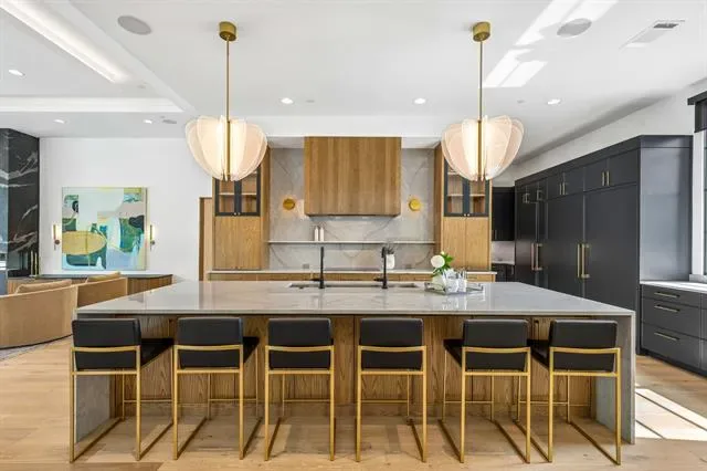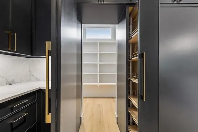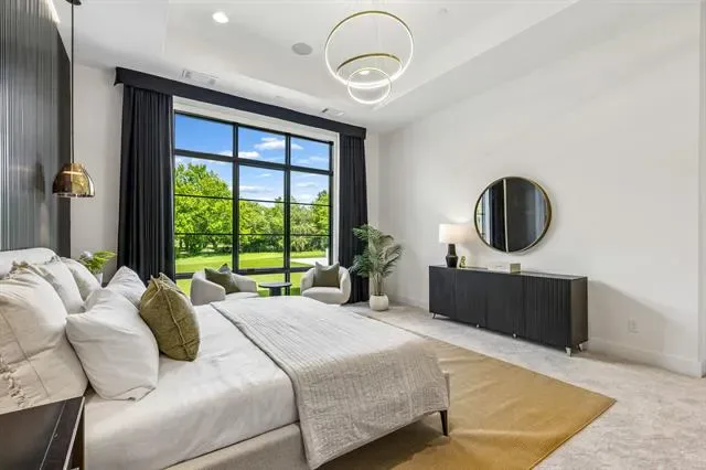 Oversized windows flood the interior with natural light, offering sweeping views of the stunning custom pool and its tranquil water features. The main floor is designed for maximum versatility and entertainment, featuring a private theater room, a cozy sunroom, and a spacious game room that includes an attached bathroom and walk-in closet, allowing it to easily serve as a comfortable sixth bedroom. The chef’s kitchen is equipped with Thermador appliances, quartzite countertops, a walk-in pantry, and a second hidden pantry with direct garage access.