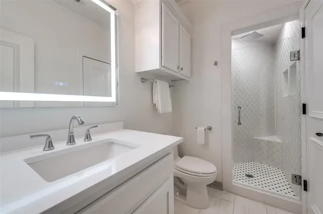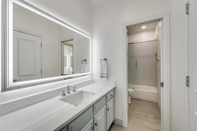 The primary bedroom is a true retreat, featuring soaring ceilings, a cozy fireplace, a seating area, a wall of windows overlooking the stunning backyard, and direct access to the outdoor living space. The elegant spa-like primary bath enhances the experience with refined finishes and a relaxing atmosphere designed for everyday comfort.