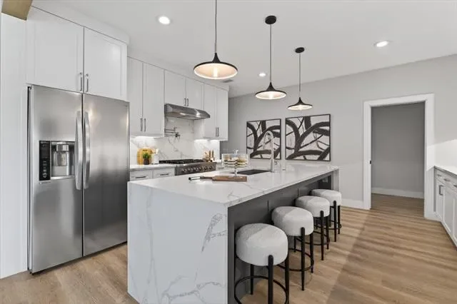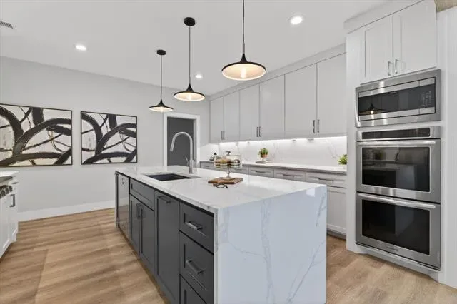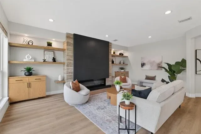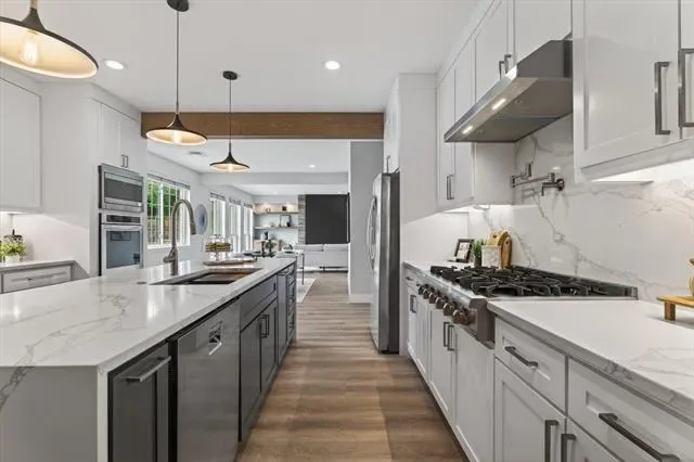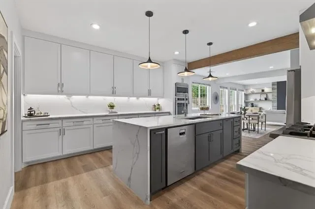 The fully remodeled kitchen is a true showstopper, featuring stunning quartz countertops that extend to the floor, a large island, ample prep space, a spacious walk-in pantry, double ovens, and elegant modern lighting. The inviting living room boasts a sleek contemporary fireplace with black tile and custom-built cabinetry complemented by stylish floating shelves. The dining room continues the custom design with beautifully crafted built-ins and a convenient dry bar, perfect for entertaining.