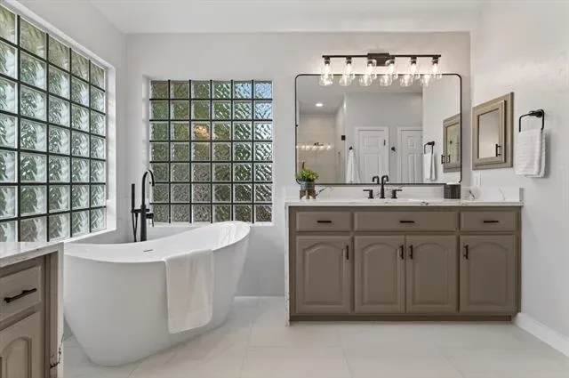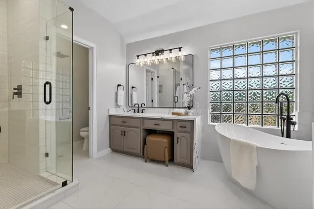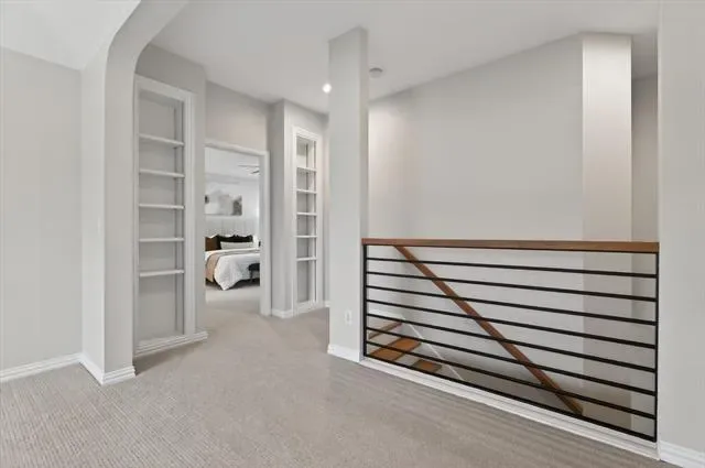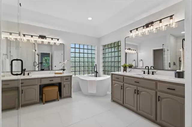 A modern staircase leads to the second floor, which has been freshly painted and features brand-new carpet. Upstairs, you’ll find a generous game-family room along with all bedrooms, each offering impressive space and comfort. The oversized primary suite includes a versatile bonus room ideal for a sitting area, nursery, gym, or additional office. The recently remodeled primary bathroom showcases modern quartz finishes, a frameless glass shower, a freestanding soaking tub, and updated designer lighting.