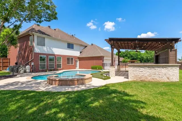 Step outside to your private backyard oasis, complete with a sparkling pool and spa, cabana, putting green, and grassy area, perfect for enjoying Texas summers. An 8-foot privacy fence enhances the outdoor experience. A long driveway and 3-car garage provide ample parking and space for all your needs.