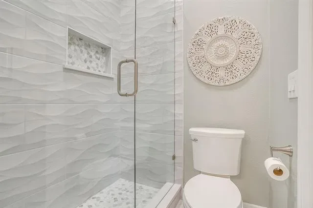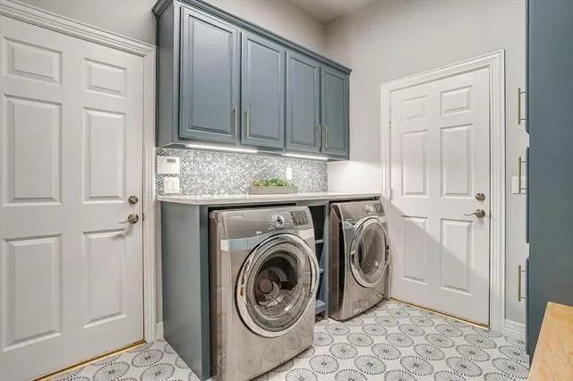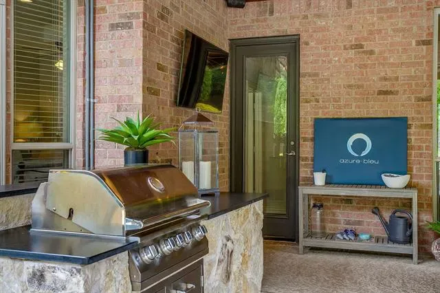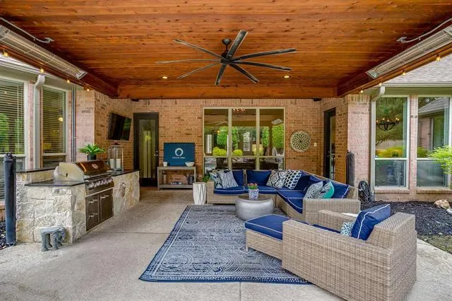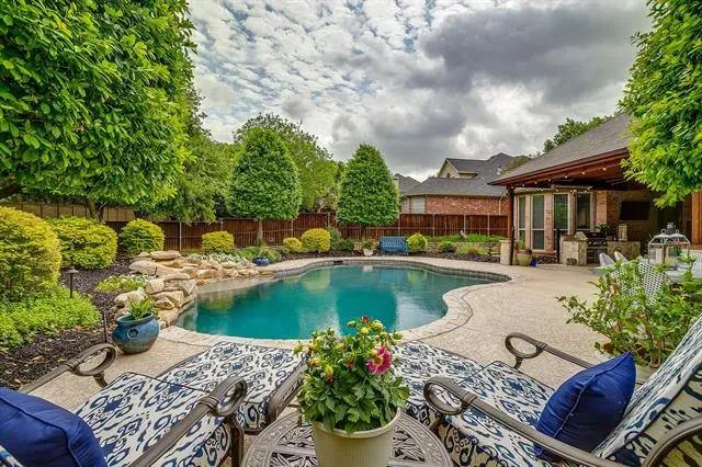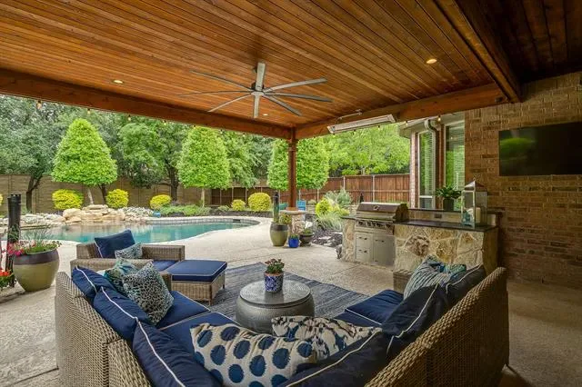 Step outside to your private outdoor oasis featuring lush landscaping, a resort-style pool with a waterfall, and a Pentair heater and chiller for year-round enjoyment. The extended covered patio is built for entertaining with a built-in grill and outdoor heaters, all surrounded by a privacy fence and mature tree line.