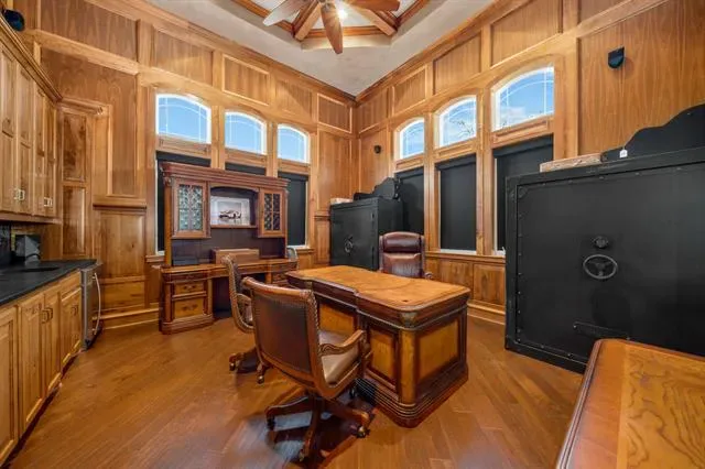 A standout feature is the extraordinary 4,000-square-foot, fully air-conditioned detached garage and shop with adjoining beautiful office adorned with coffered ceilings or lounge space which is ideal for automotive collectors, RV owners, hobbyists, or those seeking significant climate-controlled workspace. Combined with a four-car attached garage, the versatility is unmatched.
