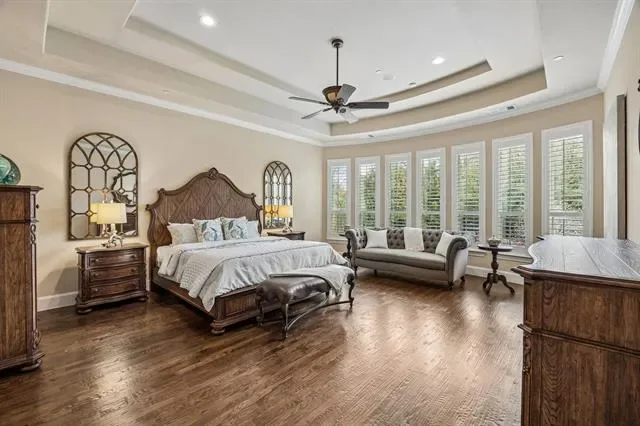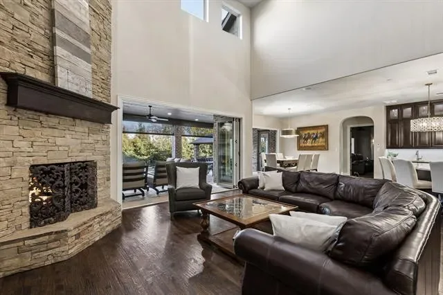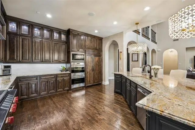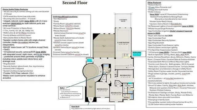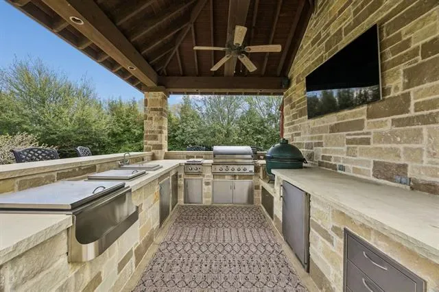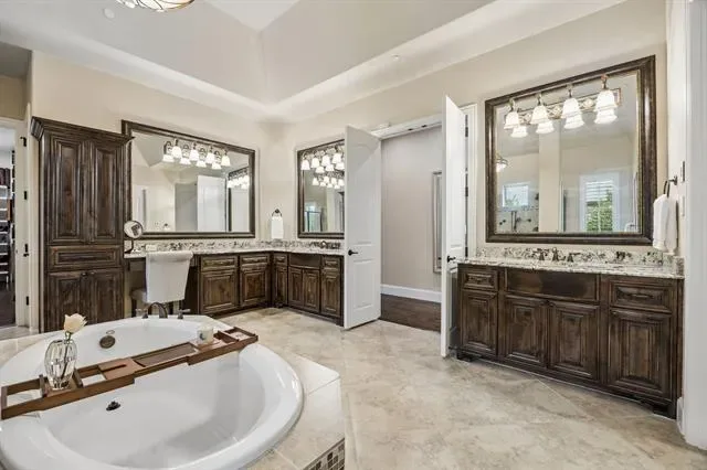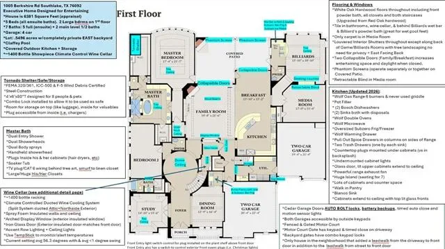 Meticulously maintained Southlake Shady Oaks home combines timeless charm, modern luxury focused on entertainment and privacy. Double iron doors open to truly special grand domed foyer, elegant chandeliers, and curved staircase. Captivating spacious, light-filled w soaring ceilings and large windows flooding home w natural light. In heart of home is expansive open concept family rm and kitchen showcasing a ~1400 bottle climate-controlled wine cellar. Family rm w fireplace, 2 sets of 12-foot collapsible doors open to covered patio w fireplace and views of east-facing outdoor oasis surrounded by mature evergreens creating a tranquil private haven. Claffey built pool, spa and covered outdoor kitchen w built-in grill, XL Big Green Egg, side burners, sink, frig, 2 drop-in coolers, seating and lg storage closet. Lounge on covered patio, host summer barbecue, or simply enjoy serenity of your surroundings. Inside, gourmet kitchen is a chef’s dream, outfitted w top-of-line appliances: built-in Sub-Zero frig, 6-burner Wolf gas range, Wolf double ovens, two Bosch dishwashers, a warming drawer, dual sinks, and more. Wet butler pantry is perfect tea coffee nook. Luxurious serene primary suite retreat w sitting area, dual vanities, separate tub, dual entry dual showerheads and dual body sprayers, including his-and-hers closet w tornado storm shelter doubling as a secure safe. On 1st floor is a large secondary ensuite bedrm, private study and media rm can open or close to adjacent game rm space, w wet bar and pool bath right inside patio door. Upstairs, 3 generously sized ensuite bedrms, another game rm w wet bar and access to a covered balcony overlooking lush yard. Every detail has been thoughtfully crafted to deliver both style and functionality including specifically designed home audio-video features to satisfy tech savvy. Walk to top-rated Carroll schools, Bicentennial Park, and The Marq. Short drive to Southlake Town Square, amazing restaurants, shopping and DFW Airport.