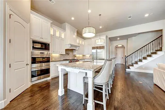 The gourmet kitchen features marble countertops, high-end stainless steel appliances, and custom cabinetry,
