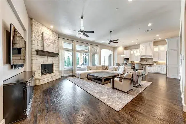 seamlessly flowing into a bright family room with a cozy fireplace and expansive sliding door windows