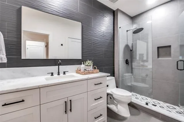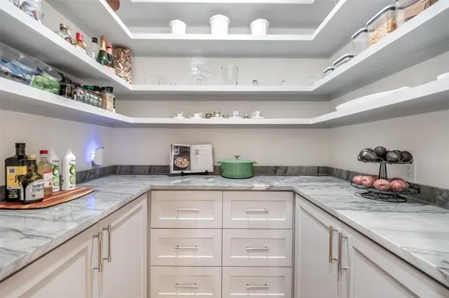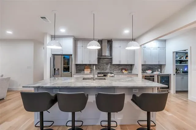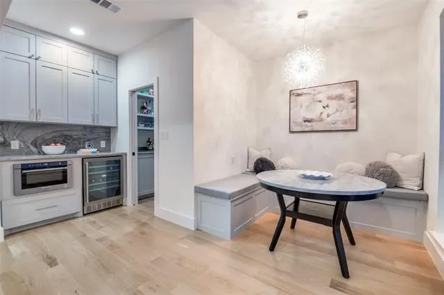 The open-concept kitchen features Brazilian quartzite countertops and a full wall backsplash, custom European beechwood cabinetry with soft-close storage, gas range, coffee station with microwave drawer, wine refrigerator, nine foot island, and a custom banquette. A walk-in pantry mirrors these finishes with ample storage. A private study with floor-to-ceiling built-ins and French doors creates a refined work-from-home retreat. The main-level guest bedroom offers privacy and comfort with access to a full bathroom with a rain shower.