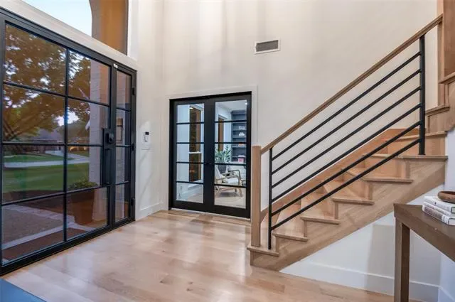 A custom steel entry door introduces a foyer with soaring ceilings, an elevated staircase, and white oak select hardwood flooring throughout. The home features multiple living areas, a dedicated study, three full bathrooms, laundry room, and a custom mudroom.