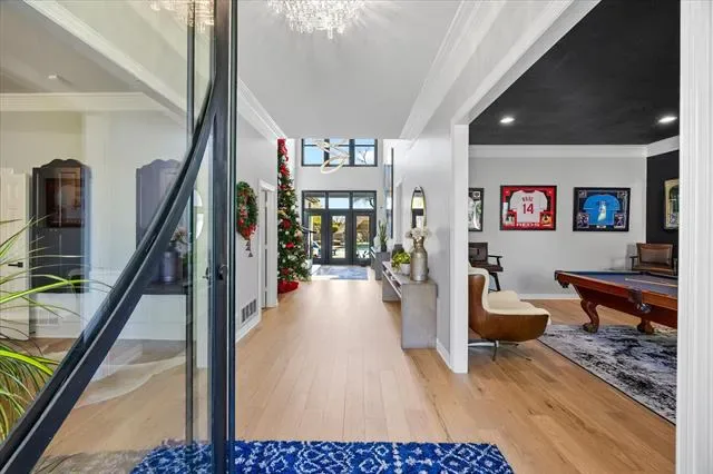 From the moment you step inside, the home captivates. A grand entry anchored by a sweeping curved staircase sets the stage for interiors designed to impress. Expansive windows flood the space with natural light, highlighting custom finishes, designer lighting, and curated architectural details that create a sophisticated yet inviting atmosphere.