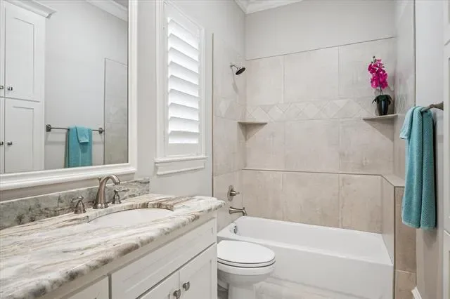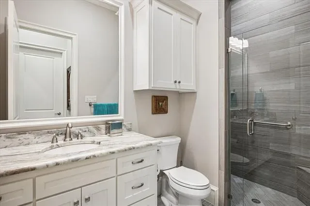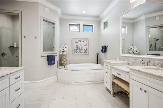 Highly sought after Watermere neighborhood, South Village is a 55+ age community. Single story 3 bedroom, 3 and 1 half bath custom villa. Open floor plan, living and dining area open to the kitchen. Huge enclosed patio with slider doors add more living space to this stunning home. Wood floors, shutters throughout, lots of natural light in every room. Iron glass front door opens to large entry, guest suite and study at entry, look into living area and yard beyond slider doors and patio. Living room has vaulted beamed ceiling, stone fireplace at one end of the room with transom windows on either side for even more natural light. Dining room sits between the kitchen and living room. Kitchen has a large butlers and walk in pantry, huge island with seating. Glass cabinets at top for display, so much storage, lots of counter top area for meal prep, serving and entertaining. 3 bedrooms all set apart for privacy. Study could be flex room or whatever new owner would like. Huge laundry room with room for second refrigerator. Primary suite is located at the back of the home for privacy. Windows overlook backyard. Large primary bathroom and large walk in closet. Enclosed patio offers fireplace at one end, slider doors on 2 sides with countertop and cabinets for entertaining and storage. Built in barbecue is just outside the slider doors. Putting green, grass area, landscaped backyard is beautiful for enjoying anytime. Low maintenance living at its finest!