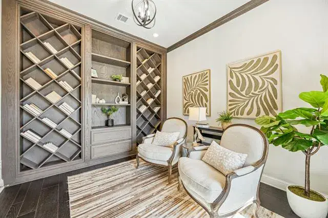 The main level features a spacious primary suite and guest bedroom, complemented by multiple living areas and a curved staircase accented by an iron handrail. The kitchen centers around a large stone countertop island and offers built-in cabinetry, a walk-in pantry, and an open flow to surrounding living spaces. A dedicated study features floor-to-ceiling custom bookshelves, creating an ideal workspace or retreat.