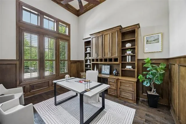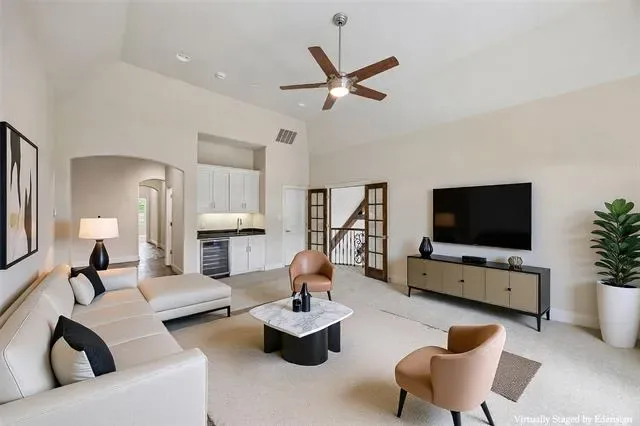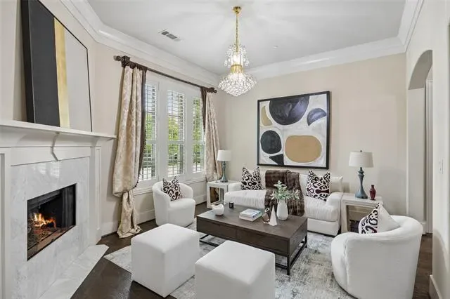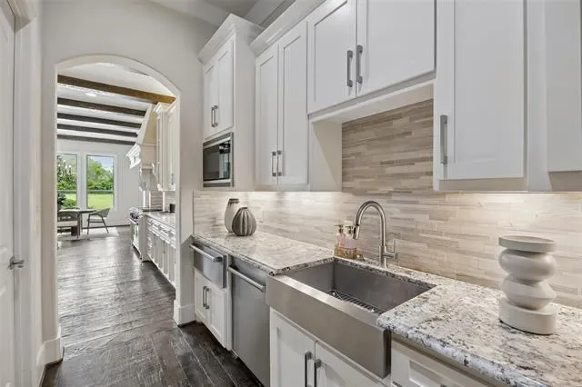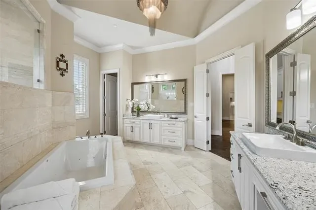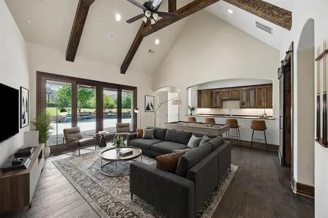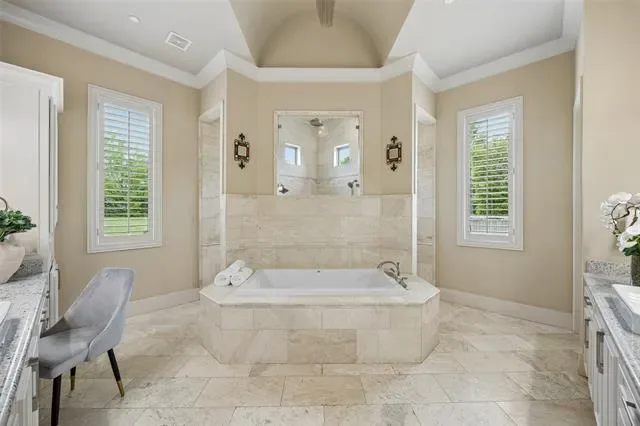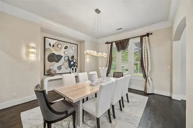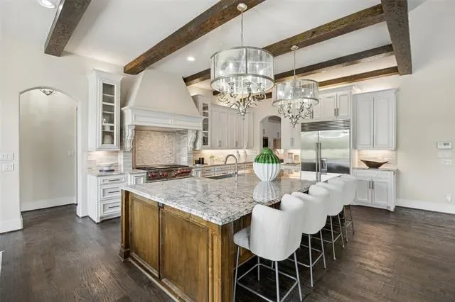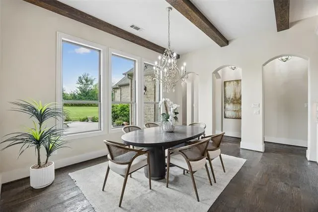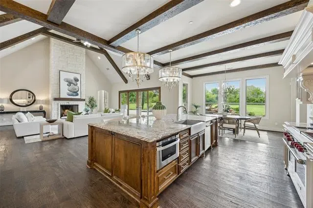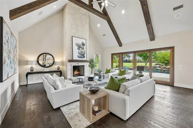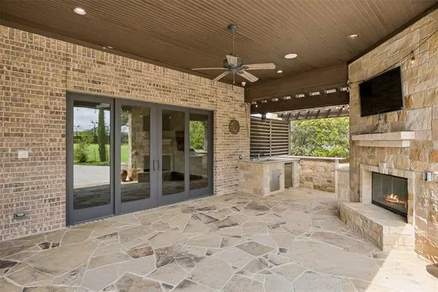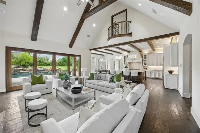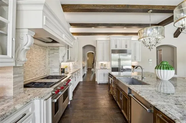 Exquisite craftsmanship &' timeless elegance define this extraordinary Hatfield Custom Home, gracefully situated on a sprawling 1 acre estate in the prestigious St. Emilion community of Southlake. From the moment you step through the grand entry, you are welcomed by soaring ceilings, rich hardwood flooring &' an atmosphere of refined luxury. Designed for both intimate living &' grand-scale entertaining, the home offers an impressive formal dining room &' an elegant formal living space adorned with a statement chandelier, a warm fireplace &' plantation-shuttered windows that bathe the room in natural light. A distinguished executive study showcases coffered ceilings, custom built-ins &' exquisite wood wainscoting. The main living area is nothing short of breathtaking, featuring vaulted, beamed ceilings &' a dramatic floor-to-ceiling stone fireplace, seamlessly blending indoor &' outdoor living w-sliding doors that open to the resort-style backyard. The gourmet chef’s kitchen is a true showpiece, appointed w-a grand island, built-in fridge, gas cooktop, double ovens, and a fully equipped butler’s pantry, crafted to impress &' perform. Primary suite is a luxurious retreat, complete w-a serene sitting area + a spa-inspired bath offering a jetted soaking tub, dual vanities &' a custom WIC. The home continues to impress with a 1st floor game room featuring a wet bar, a fully equipped media room w-theater seating &' an additional upstairs game room w-its own Juliet balcony + generously sized guest suites. Every detail has been thoughtfully curated, including a spacious utility room with an oversized island &' abundant storage, an exercise room, a wine cellar &' a well-appointed guest suite on the main level. Step outside to your private resort oasis, where a covered patio with a stone fireplace &' outdoor kitchen overlooks a sparkling pool &' spa with a dramatic rock waterfall. The expansive grounds also feature a sport court and ample green space, all complemented by a 4 car garage.