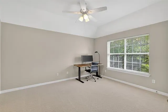 Step inside is the open floor plan filled with natural light and features rich hardwood floors, high ceilings, and large windows with plantation shutters. The functional kitchen is equipped with stainless steel appliances, granite countertops, extensive cabinetry, and a generous breakfast area—ideal for everyday living and entertaining. Seamlessly open to the family room, this space serves as the heart of the home. The light-filled dining room sits just off the kitchen, while the formal living room near the entry offers versatility as a sitting area or the perfect space for a piano. A separate flex room with premium exercise flooring over hardwood offers additional versatility as a private office or fitness space.