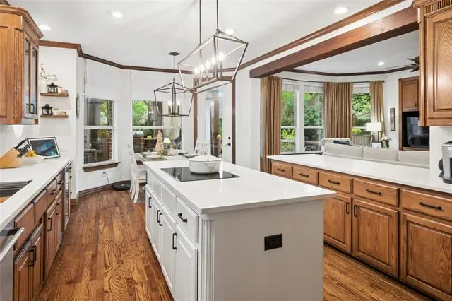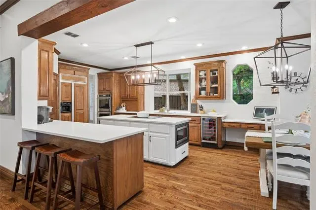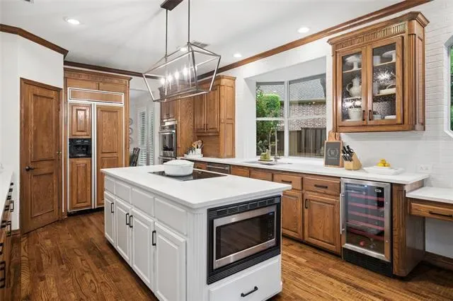 Built-in Features, Built-in Wine Cooler, Cable TV Available, Cathedral Ceiling(s), Chandelier, Decorative Lighting, Double Vanity, Eat-in Kitchen, Flat Screen Wiring, Granite Counters, High Speed Internet Available, Kitchen Island, Natural Woodwork, Open Floorplan, Paneling, Pantry, Smart Home System, Vaulted Ceiling(s), Walk- In Closet(s)