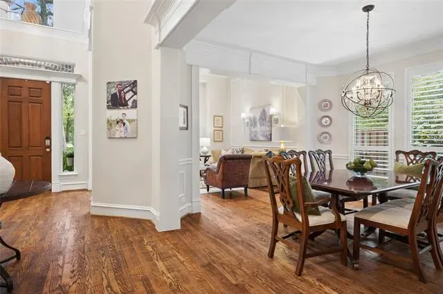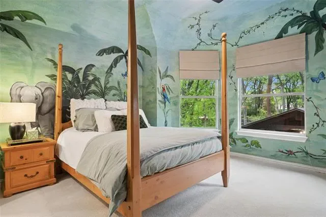 Offering five bedrooms (currently configured as four bedrooms with a study), four full bathrooms, and a large game room, this move-in ready home showcases true hardwood flooring throughout most of the home, designer colors, and elevated finishes at every turn. The heart of the home is the stunning, oversized kitchen featuring dual islands, newer KitchenAid Café appliances, quartz countertops and a seamless flow into the spacious family room and breakfast nook. Walls of windows frame serene views of the expansive, two-level deck and pergola—perfect for entertaining or relaxing in the pool sized backyard. A custom putting green is tucked among the mature trees, creating a peaceful outdoor retreat.