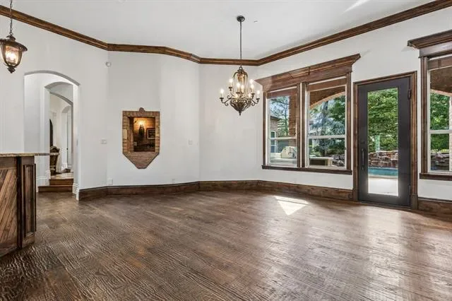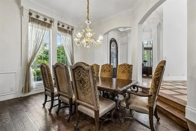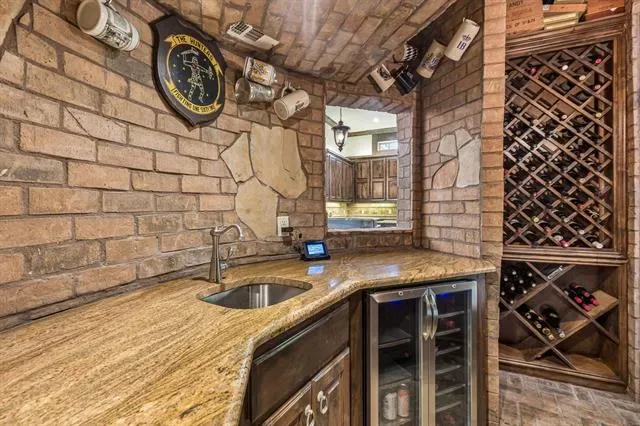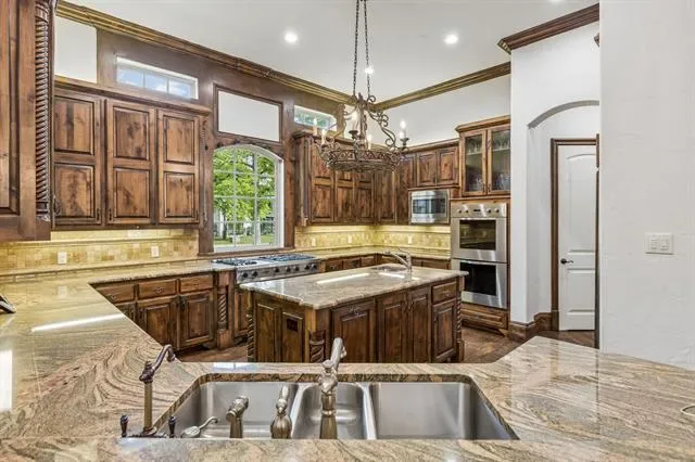 The chef''s kitchen delights with custom wood cabinetry, a gorgeous island, and professional Viking appliances including a 6-burner range with griddle, double ovens, two dishwashers, and a built-in Sub-Zero refrigerator. The adjoining wine room features brick accents, custom shelving, and premium wine storage.