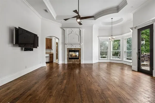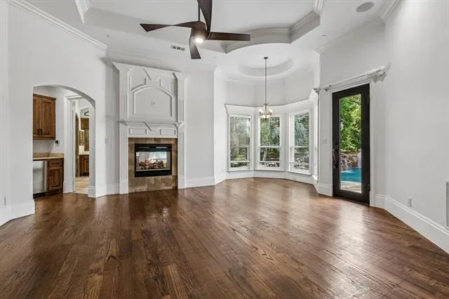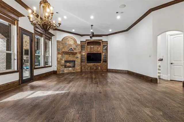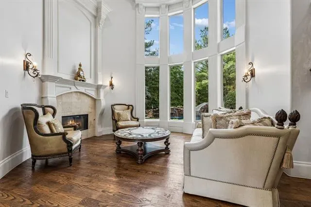 Enter through the soaring foyer with custom wood-and-stone flooring, an ornate wrought iron chandelier, and a dramatic curved staircase. The formal living room captivates with grand bay windows and a custom stone fireplace featuring fluted columns and intricate crown molding.
