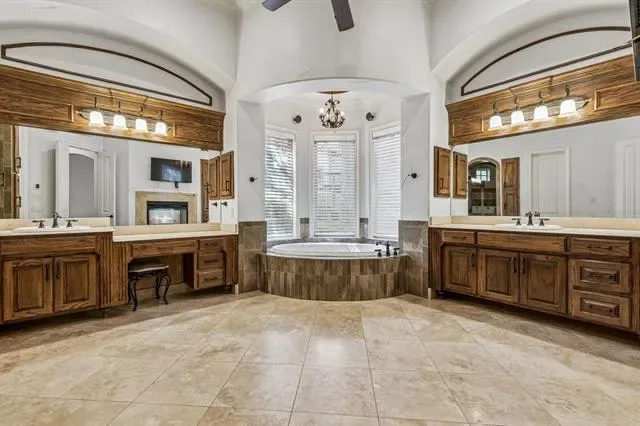 The sophisticated study features a dramatic rotunda dome ceiling, extensive built-in bookshelves, and a curved bay window reading nook. The expansive primary suite offers a multi-level tray ceiling, custom fireplace, pool-view sitting area, and bar with beverage refrigerator. The spa-inspired ensuite features diamond-cut stone floors, two custom vanities, a jetted soaking tub, walk-in shower, see-through fireplace, and grand walk-in closet.
