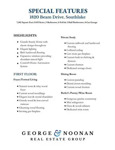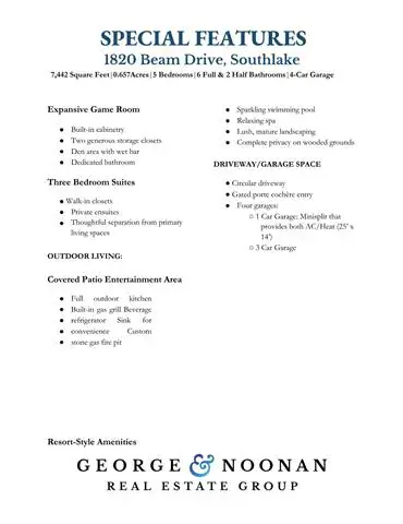 Exceptional by design, extraordinary by nature. Commanding a private, wooded sanctuary in the heart of Southlake''s most coveted neighborhood, this 7,442 sq ft home presents a rare opportunity to experience refined living. Exemplary architectural distinction exudes luxury across 5 ensuite bedrooms &' thoughtfully curated spaces designed for the most discerning homeowner. The gated porte cochère motor court establishes immediate distinction, offering privacy &' a refined sense of arrival. Step inside to discover a thoughtfully designed floor plan featuring formal living &' dining rooms adorned w elegant lighting, rich hardwood floors, and luxurious accents. The gourmet kitchen stands as a culinary masterpiece, showcasing premium appliances, an oversized island w leathered granite, &' a walk-in pantry. The adjacent breakfast room provides an inviting setting for casual family meals, while the private study—complete with custom built-ins and a cast stone fp—offers a serene sanctuary for work. The 1st floor primary suite is a true retreat, featuring a cast stone gas fp, sophisticated dry bar, &' spa-inspired ensuite with 2 vanities, walk-in glass shower, &' soaking tub. The expansive closet w custom built-ins &' dedicated gym space or nursery w patio access completes this luxurious sanctuary. A second first-floor ensuite bedroom accommodates multigenerational living or distinguished guests. Entertainment reaches new heights w the tiered media room on first floor, featuring professional lighting &' custom projection screen, while the upstairs game room w wet bar &' 3 additional ensuite bedrooms provide private retreats for family or guests.The outdoor spaces transform the grounds into a resort-style sanctuary. The covered patio showcases a complete outdoor kitchen, custom stone fp, &' sparkling pool &' spa surrounded by mature landscaping. This exceptional estate represents more than a home—it is a lifestyle statement where every detail delivers comfort, luxury, and functionality.
