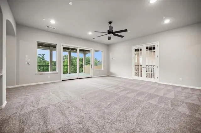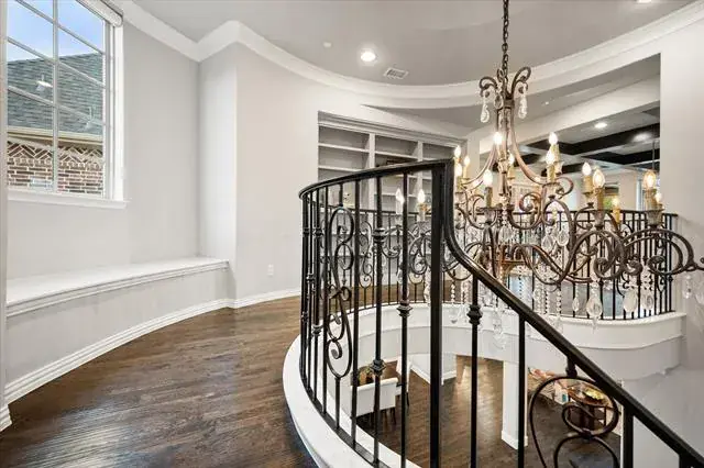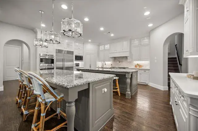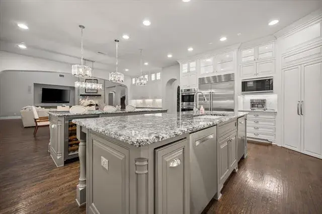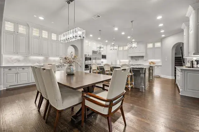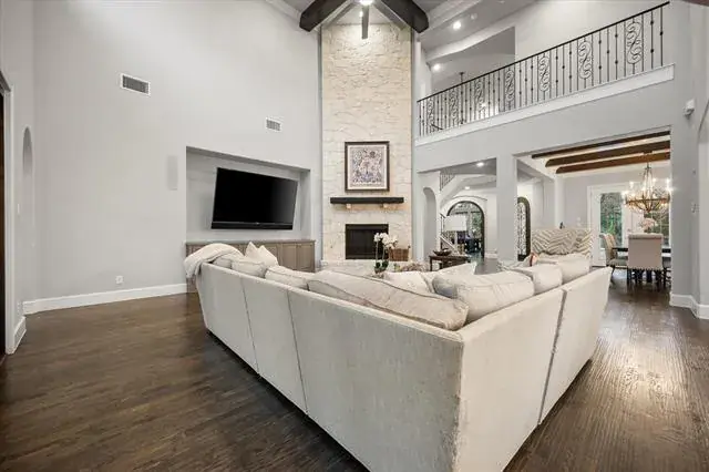 Located in the prestigious Winding Creek community of Southlake, 1012 Cool River Drive is a custom French-inspired estate blending timeless architecture with serene pond and greenbelt views. The stone façade, refined rooflines, and manicured landscaping create exceptional curb appeal and elegant presence. A dramatic two-story foyer with sweeping spiral staircase opens to water views beyond. Designed for entertaining and everyday comfort, the great room offers soaring vaulted ceilings, a floor-to-ceiling fireplace, and expansive accordion doors leading to a covered patio with outdoor cooking area and peaceful backyard views. Natural light fills the open-concept living spaces throughout. Chef’s kitchen anchors the home with dual custom islands, abundant cabinetry, Sub-Zero refrigerator, Wolf appliances, double convection ovens, walk-in pantry, and generous prep space. A temperature-controlled wine fridge, butler’s pantry, and built-ins add sophistication and function. The main-level primary suite features tranquil views and a spa-inspired bath with soaking tub, oversized double shower, separate vanities, and custom walk-in closets. A private guest suite and versatile media room also located on the first floor. Upstairs includes a spacious game room with refreshment bar, and balcony overlooking the greenbelt. With five ensuite bedrooms, six full baths, powder bath, dedicated office with built-in cabinetry, oversized four-car garage, and approximately 6,036 square feet, this Southlake luxury home offers wood flooring, designer lighting, smart home features, tankless water heater, and ample storage. Ideally located within walking distance to Southlake Town Square and minutes from award-winning Carroll ISD, parks, trails, and fine dining, this estate delivers privacy, convenience, and refined living in one of Southlake’s most desirable neighborhoods.