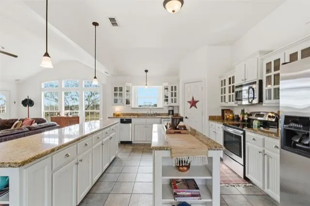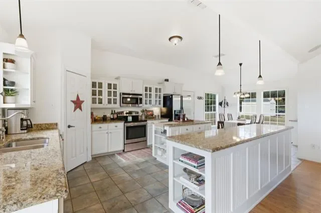 Built-in Features, Cathedral Ceiling(s), Decorative Lighting, Granite Counters, Kitchen Island, Open Floorplan, Vaulted Ceiling(s), Walk- In Closet(s)