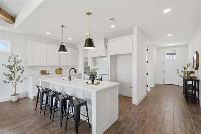 The entry opens into a spacious living area featuring wood look tile flooring, natural light, and a striking fireplace that creates a warm focal point. The open concept layout flows seamlessly into the kitchen, where you will find a large center island, abundant cabinetry, sleek countertops, and designer lighting that adds both style and function.