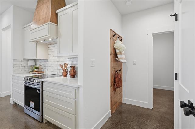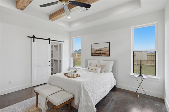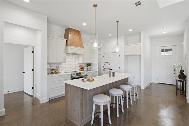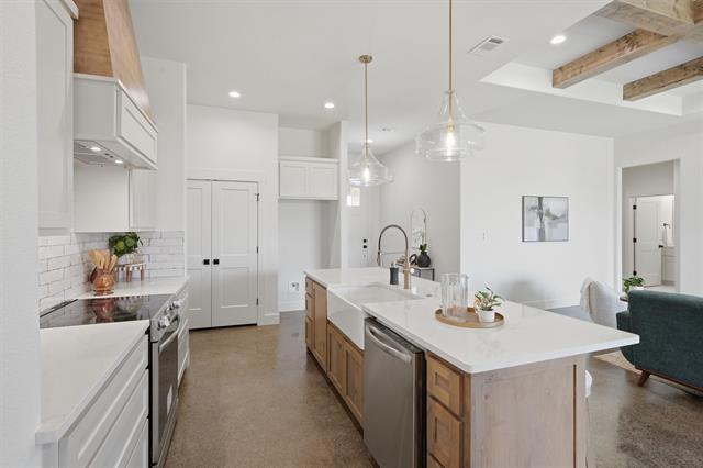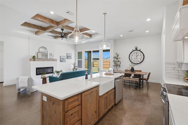 Inside, you’ll find stained concrete floors that bring durability and style, paired with a bright, airy living space highlighted by a beamed ceiling detail and a sleek electric fireplace insert. The kitchen is a standout with a large island, custom cabinetry, designer lighting, and warm wood accents that add character and depth.