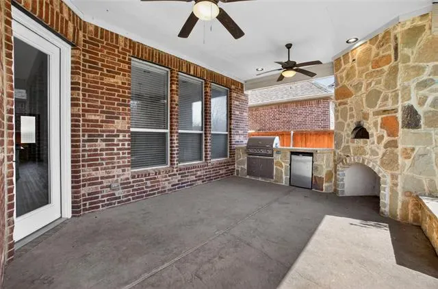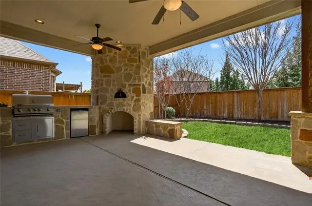 Backyard retreat features an extended covered patio, outdoor kitchen, and pizza oven—an entertainer’s dream!