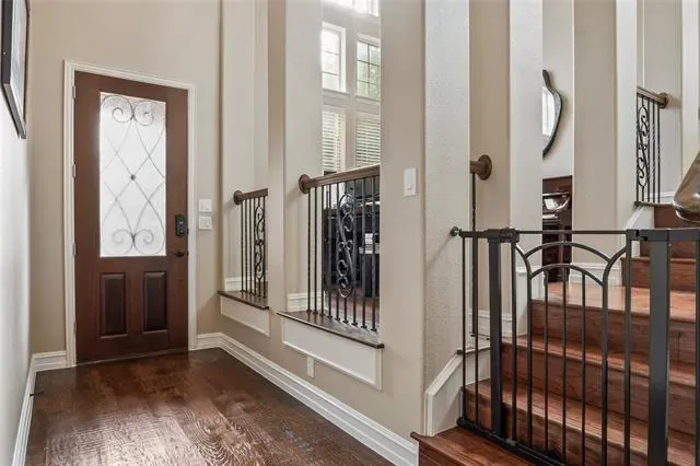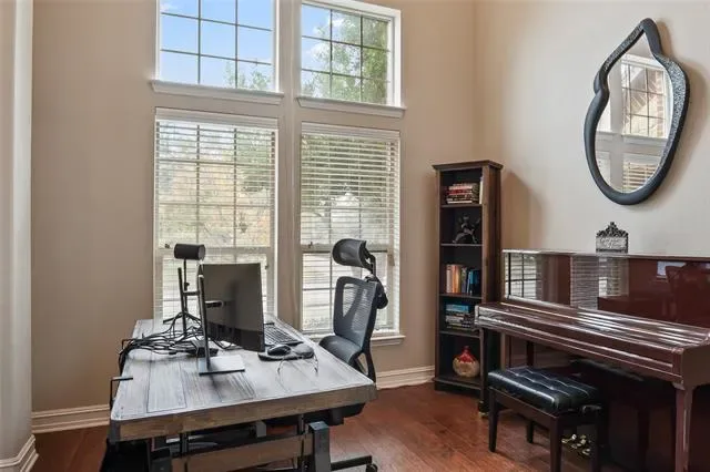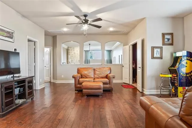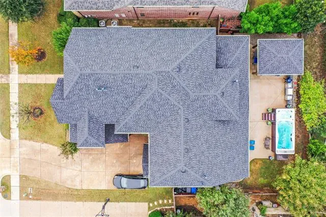 NEW LOW PRICE. The perfect floorplan for your growing family. Five bedrooms, including the master suite and guest suite downstairs. Three living spaces including main family room with floor to ceiling fireplace. The kitchen is complete with an abundance of custom cabinetry, granite countertops, island seating, stainless steel appliances including double oven and walk in pantry. Game room and fully equipped media room upstairs. Elevated flex space at entry serves well as office, library, music room or additional living space. Private lot adjacent to Corp of Engineers woodlands. Outdoor living includes covered back patio and cabana with extended concrete flatwork. Three car garage parking with multiple Tesla chargers. Recently installed roof and gutters. Easy access to miles of trails, private lakes and over 800 acres of protected park land. Short walk or bike ride to Byron Nelson HS.