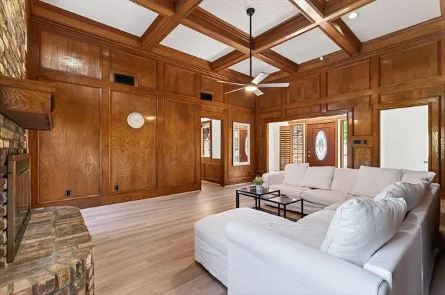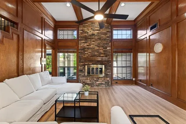 As you enter, you’re greeted by a spacious living room with soaring ceilings, bricked wood burning fire place, and gorgeous natural-tone LVP flooring. The cozy kitchen flows seamlessly into the breakfast nook or dining area, offering flexibility for everyday living and entertaining.