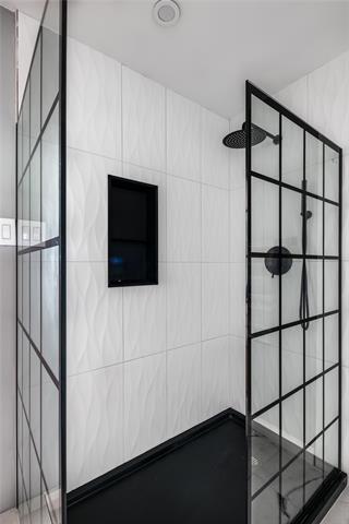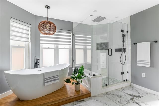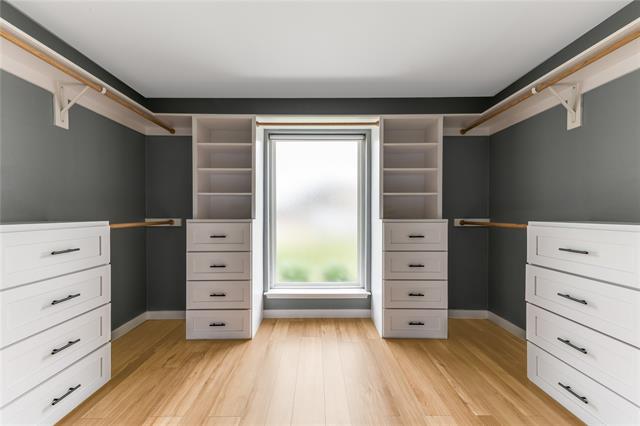 The primary suite is a retreat in the truest sense. A wood-burning fireplace anchors the room while the spa bath delivers a soaking tub, LED rain shower, heated floors, a custom wardrobe that feels tailored to the space, and a Bluetooth-enabled fixture that controls temperature, humidity, lighting, and music