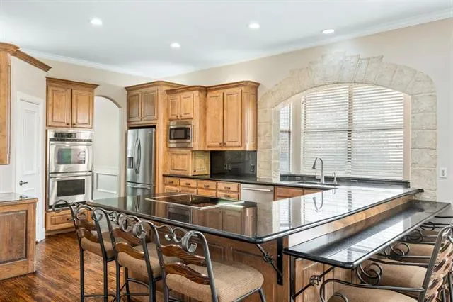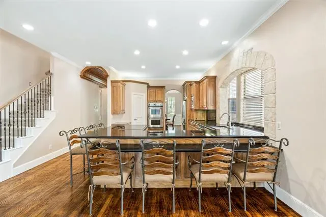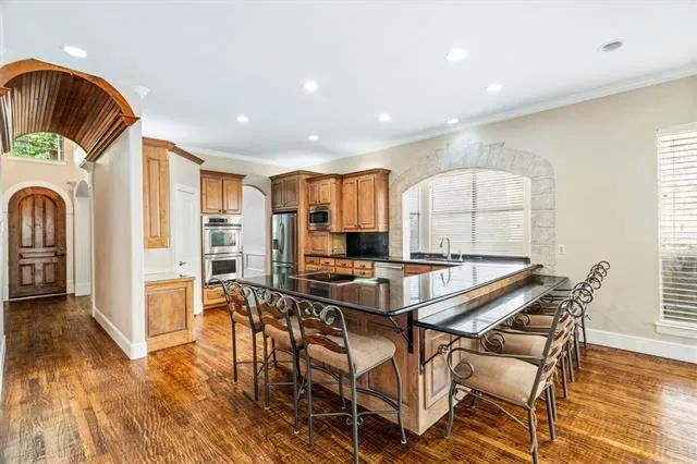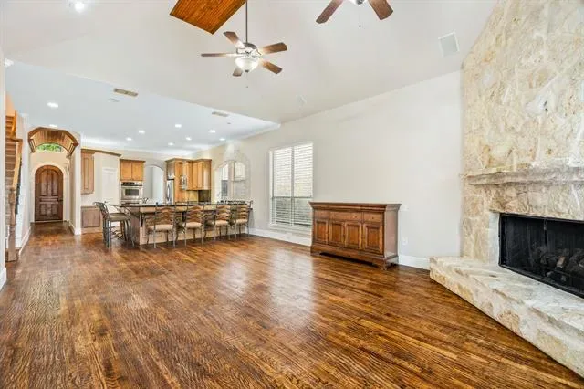 Tucked inside a private gated enclave in the heart of Trophy Club, this stunning stone-front residence offers the rare combination of luxury, community, and unbeatable location. From the moment you arrive, the European-inspired limestone exterior, dual Juliet balconies, and arched hardwood entry door set the tone for what''s inside. Soaring vaulted ceilings with exposed wood beams, rich hardwood floors throughout, and a floor-to-ceiling stone fireplace anchor the open living space with warmth and character. The chef''s kitchen impresses with custom cabinetry, dark granite countertops, stainless double ovens, a built-in microwave, and an oversized wraparound island with seating for the whole crew. A formal dining room with wainscoting, a built-in desk nook, and covered back patio with ceiling fans round out a home designed for both everyday living and effortless entertaining.The backyard is private, landscaped, and ready for your vision. But the real story here is where you''re sitting. Steps from your front door, grab a bite at HG Supply or explore the growing Trophy Club dining scene. The Westlake financial drive is just minutes away. Dallas and Ft Worth are easily accessible, too. Heading to Southlake Town Square for shopping, dining, or a movie? You''re barely 10 minutes away. And DFW International Airport? Less than 20 minutes — a serious win for frequent travelers or anyone with family flying in. This lock-and-leave luxe villa is one of DFW''s most coveted suburban pockets — where neighborhood charm meets metropolitan convenience. Welcome to the good life at 4 Hanna Court.
