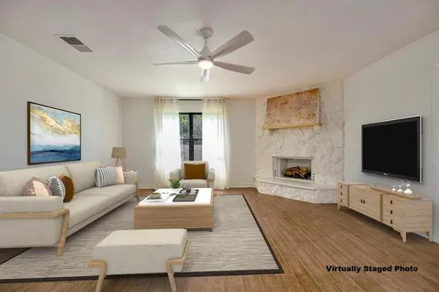 Living Room, Raised Hearth, Stone, Wood Burning