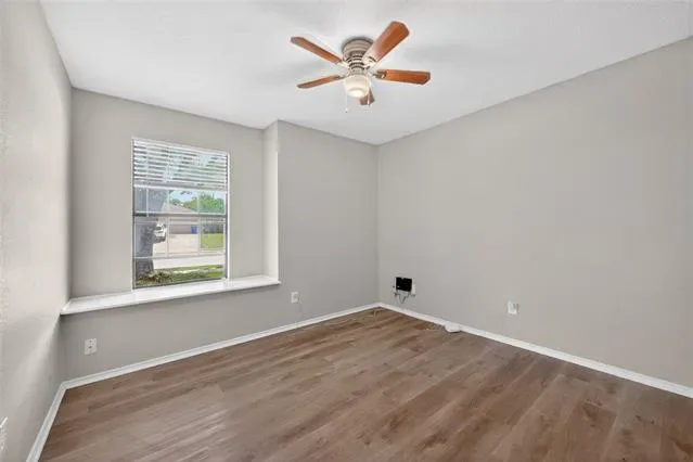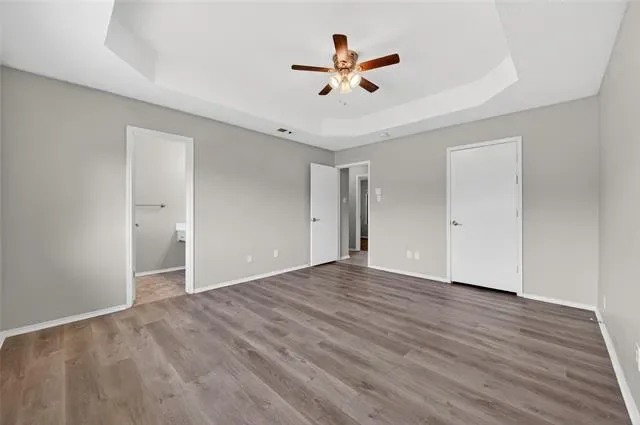 The primary suite is generously sized with a tray ceiling, a large walk-in closet, &' an ensuite bath with a makeup area, white cabinets, &' separate shower. One of the secondary bedrooms includes a lovely window bench, perfect for curling up with a book or giving pets a favorite sunny spot.