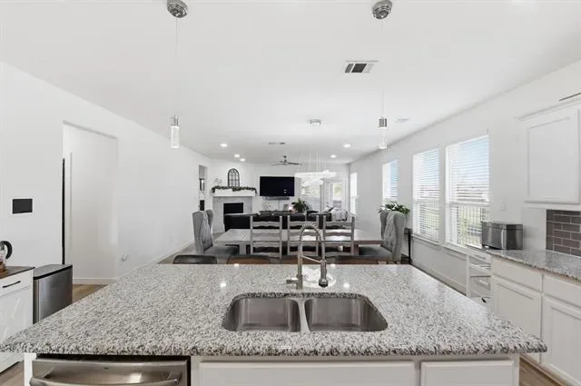 The spacious living area is centered around a cozy fireplace and flows seamlessly into the kitchen and breakfast area, creating an ideal space for everyday living and entertaining. The kitchen is equipped with granite countertops, built-in cabinetry, and a pantry, offering both style and practicality.