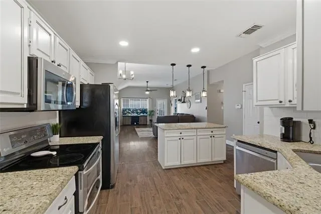 Decorative Lighting, Double Vanity, Granite Counters, Kitchen Island, Open Floorplan, Vaulted Ceiling(s), Walk- In Closet(s)