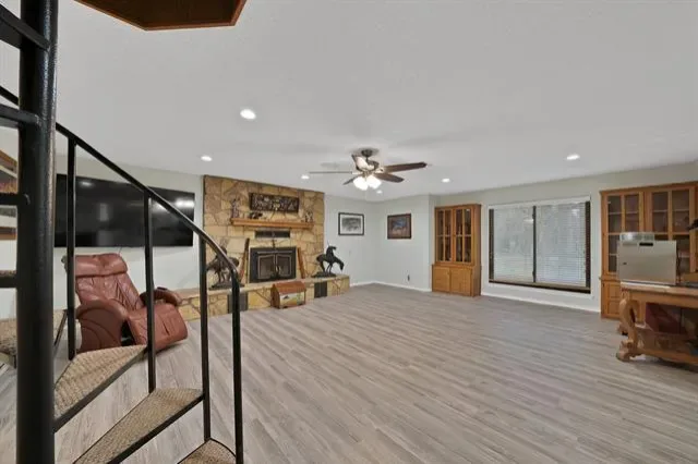 Blower Fan, Brick, Den, Living Room, Stone, Wood Burning