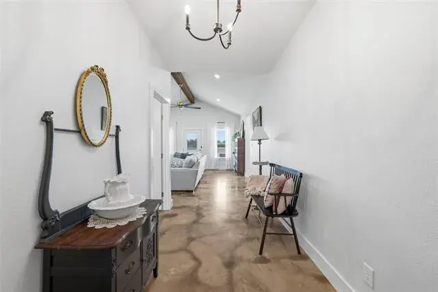 The farmhouse, a true masterpiece of design, is just over a year old and crafted to accommodate every need. It features generously sized bedrooms, with the Primary Bedroom offering serene views of the peaceful property. The Primary Bathroom is a luxurious retreat, boasting an oversized two-person shower with dual shower heads and an enormous walk-in closet. The home is adorned with exquisite, one-of-a-kind acid-washed stained concrete floors, adding a touch of sophistication and uniqueness.