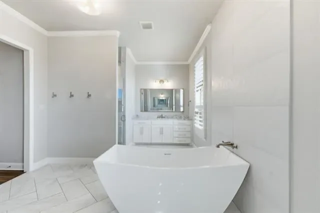 The private primary retreat offers dual oversized closets, separate vanities, soaking tub, spa style bath, and an infrared sauna.