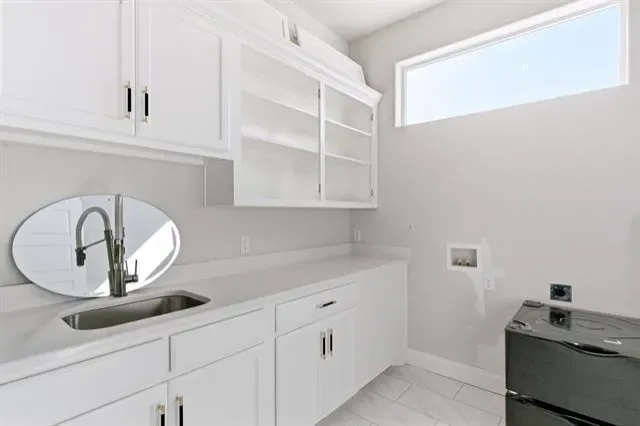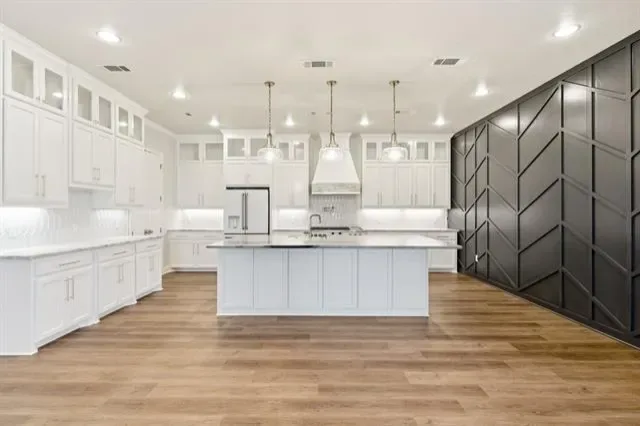 The chef’s kitchen is built to impress with a commercial-grade gas range, oversized island, abundant cabinetry, expansive prep space, and a massive walk-in pantry complete with a second refrigerator hook up. The open-concept layout flows seamlessly into multiple living and dining spaces anchored by a dramatic floor-to-ceiling fireplace crafted from reclaimed brick sourced from a historic Weatherford farmhouse.