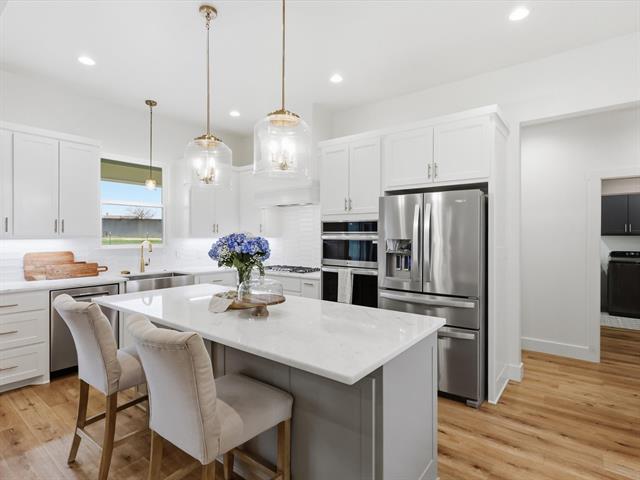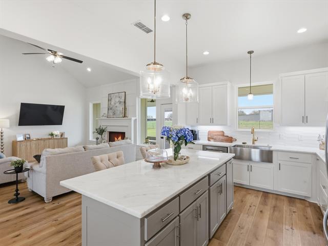 Inside, you’ll find thoughtful design and elevated finishes including marble countertops, champagne gold hardware, and custom cabinetry with soft-close drawers. The kitchen features a gas range stove and large walk-in pantry, flowing seamlessly into the main gathering area for easy everyday living and entertaining.