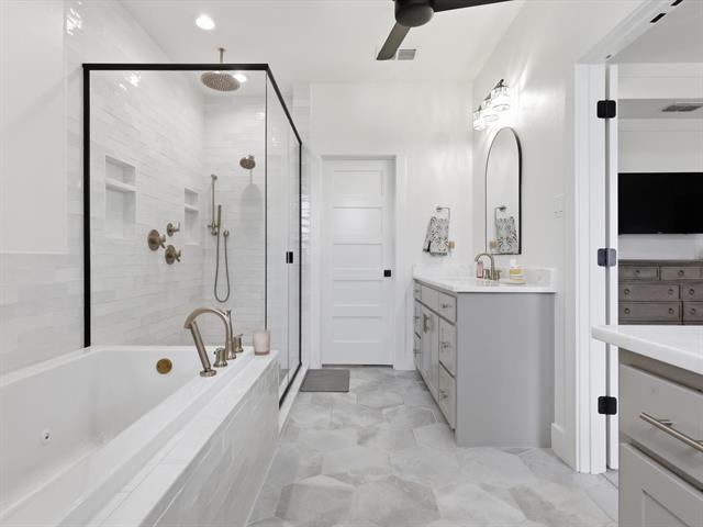 The bathrooms feature oversized cast iron tubs, while the primary suite offers an extra-large jacuzzi tub, rainfall showerhead, and a closet with a three-tiered clothing rack perfect for organizing seasonal wardrobes.