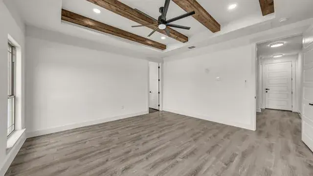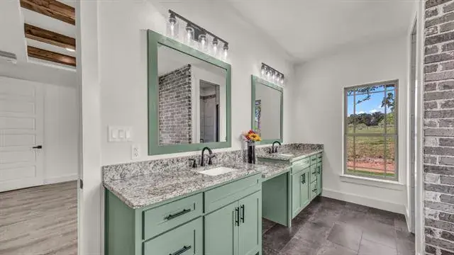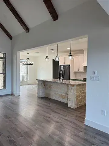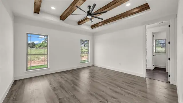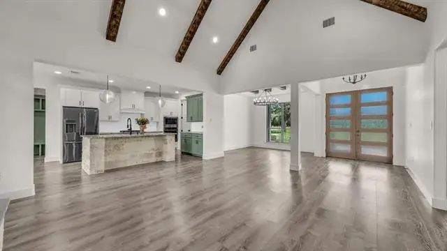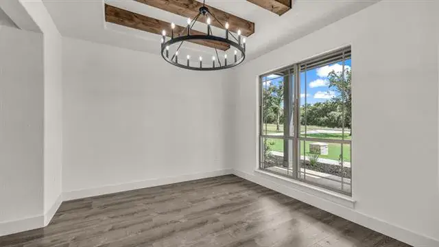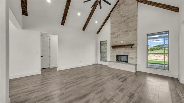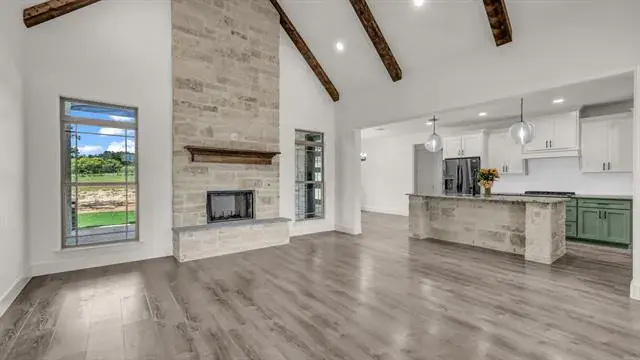 Beautiful 4 bedroom, 3 full bathroom home with lots of special touches! Split Bedrooms. 4th bedroom upstairs with it’s own full bathroom; could be used as media room, den, office, 2nd primary or you decide! Step through the beautiful front doors to the large entry and enjoy the Open concept – Living room, Dining room, Kitchen and even the Breakfast area. Tons of natural light! Tall, Beamed, Decorative Ceilings with amazing Light fixtures. Floor to ceiling Stone Fireplace. LOTS OF WINDOWS. Large 9 x 8 Utility room off Primary Bedroom closet. Luxury Vinyl Floors are great for kids, pets and Country Living. 9 x 8 Panty. Abundant Closet, Linen and Cabinet space. Mudroom with storage to catch ALL the things on the way in from the OVERSIZED Garage. Bermuda Sod yard, Landscaped flower beds, Front and Back Sprinkler System, Large scattered Trees, Partially fenced. Enjoy your coffee or entertain on the Awesome 16 x 12 Covered Back Porch. Come see what this home has to offer! Seller has changed out several light fixtures and painted the garage floor.