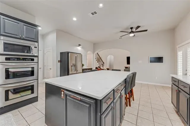 Inside, you''ll find an extra-large gourmet kitchen, featuring an oversized island with quartz countertops, and abundant cabinetry. The versatile